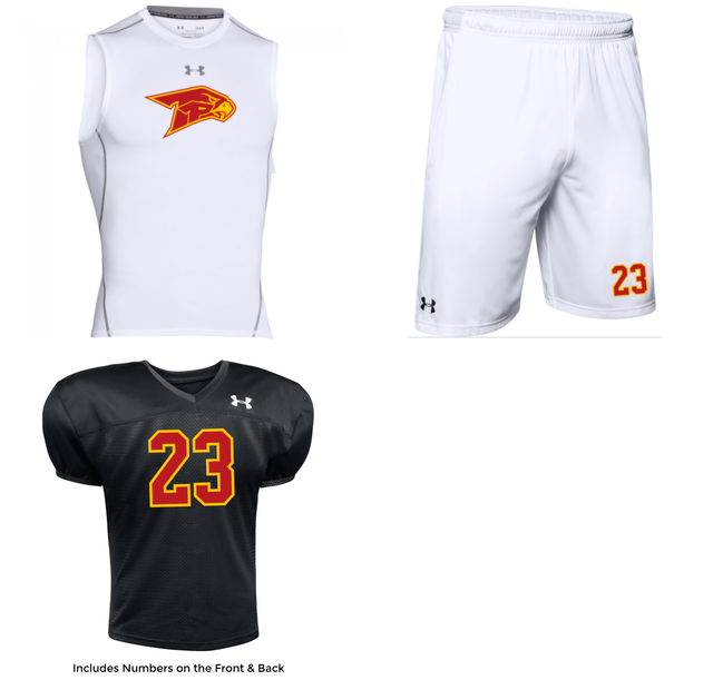 UA HeatGear Sleeveless Compression Shirt, UA Locker Shorts, Varsity UA Football Jersey.